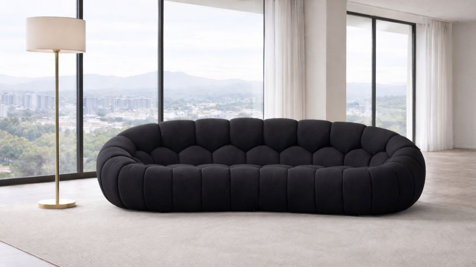 Découvrez TRILOGIA, un canapé arrondi 3 places design. Le canapé de la collection TRILOGIA se distingue par sa silhouette incurvée, ses formes généreuses capitonnées et son revêtement en tissu bouclette noir d’une douceur incomparable.