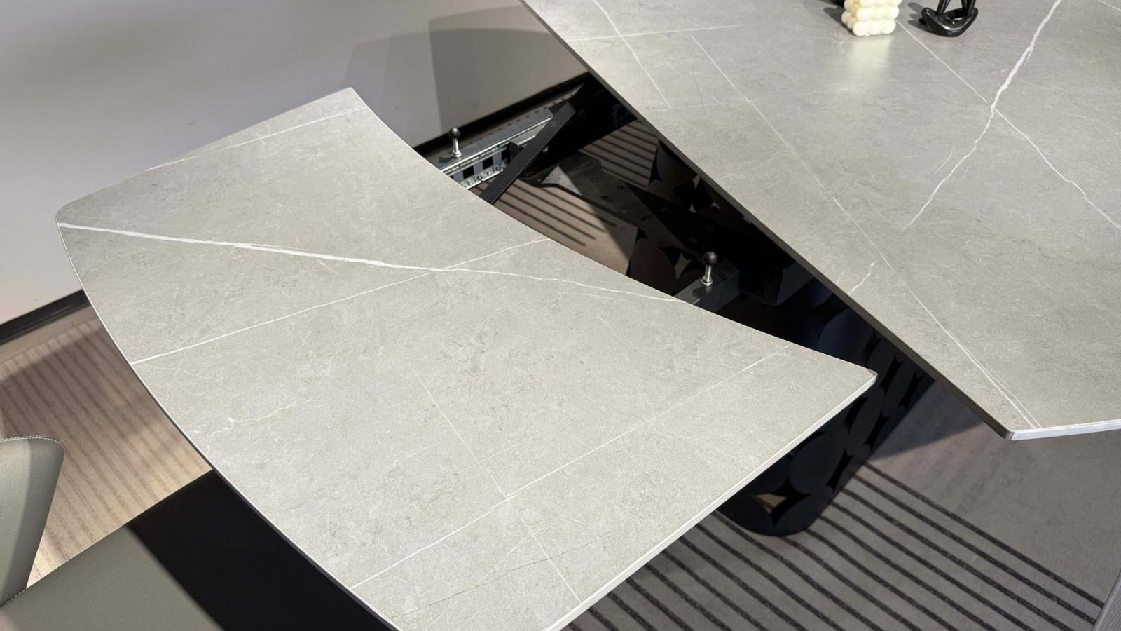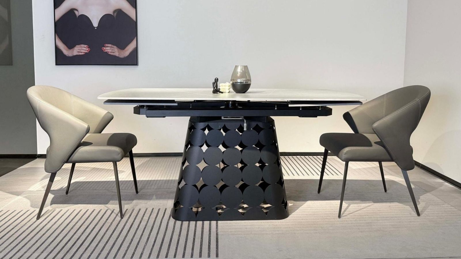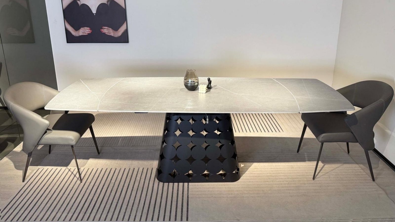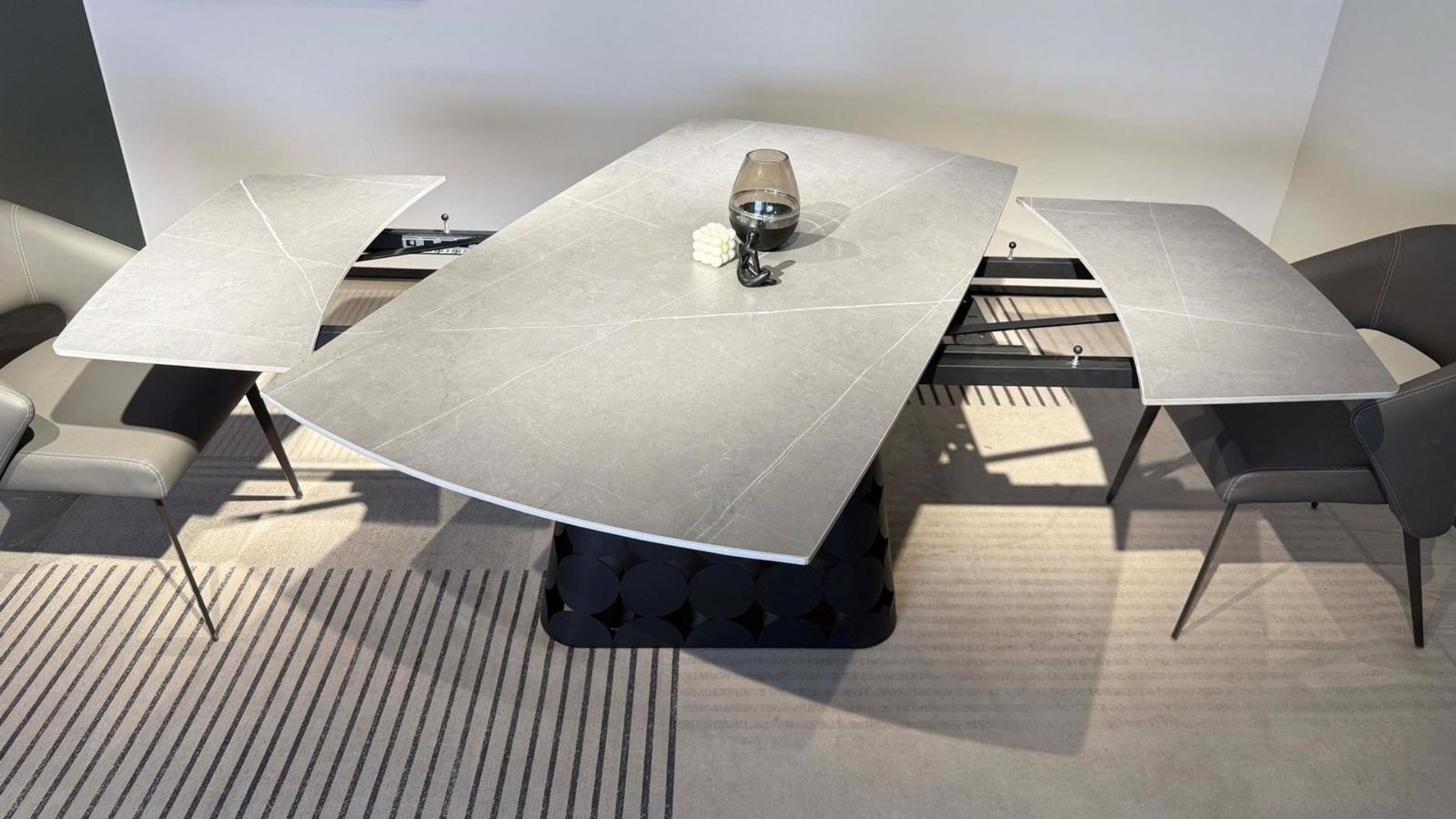 Découvrez GRANDIOSO, une table à manger extensible rectangulaire d’exception, alliant design contemporain et praticité haut de gamme. Sa structure élégante en métal noir contraste harmonieusement avec son plateau en céramique effet marbre gris, pour un rendu aussi raffiné que résistant. Grâce à son système de rallonges intégrées, elle s’adapte à toutes les occasions – des repas quotidiens aux grandes réceptions.