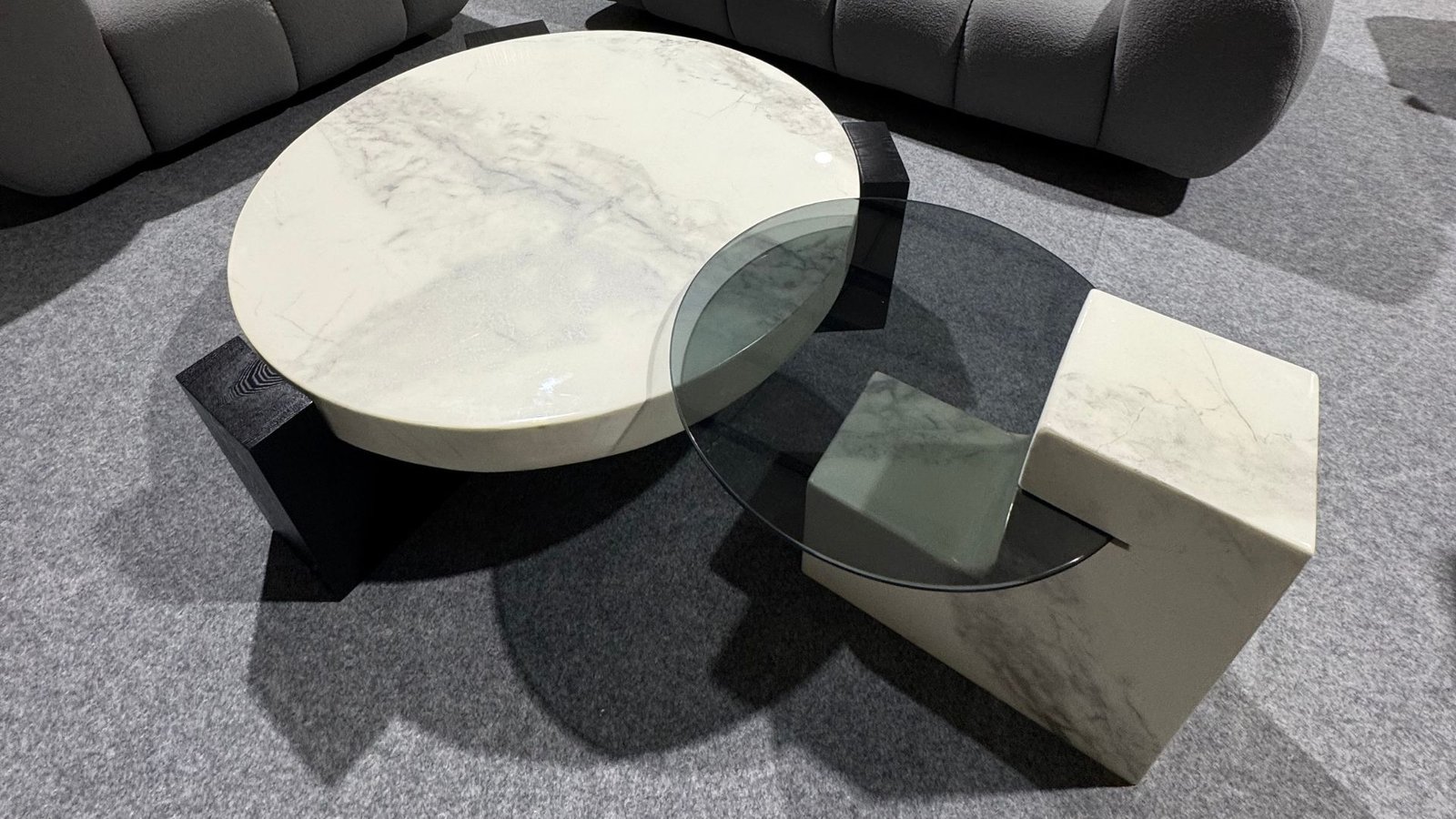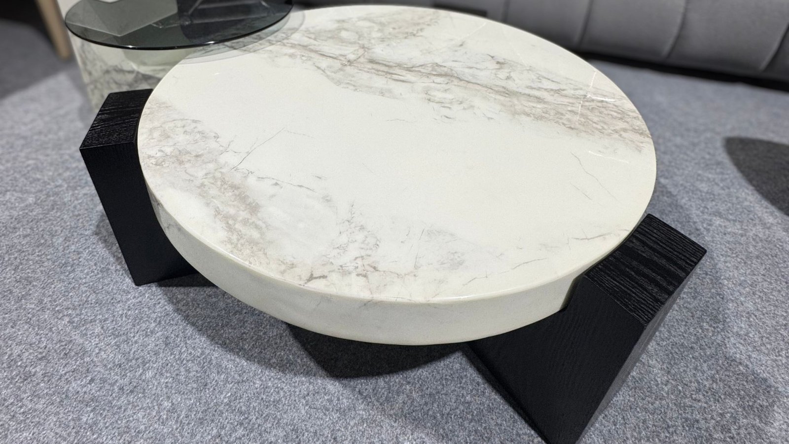 Matériaux : Marbre blanc veiné, bois d’ébène noir, verre trempé