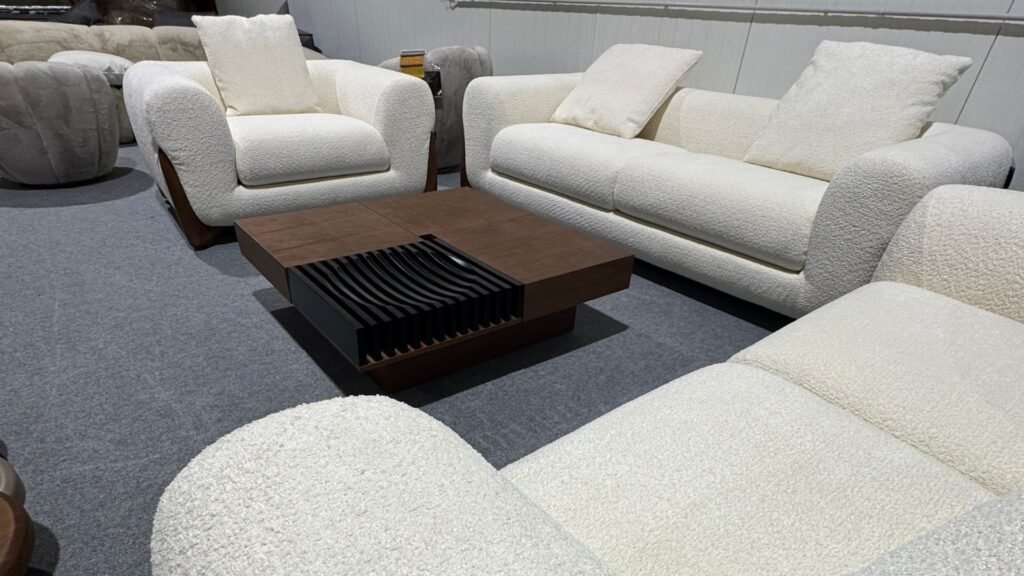 Le tissu bouclette est aujourd’hui très tendance dans l’univers du mobilier grâce à sa texture douce et chaleureuse, composée de petites boucles qui lui donnent un aspect cosy et élégant.